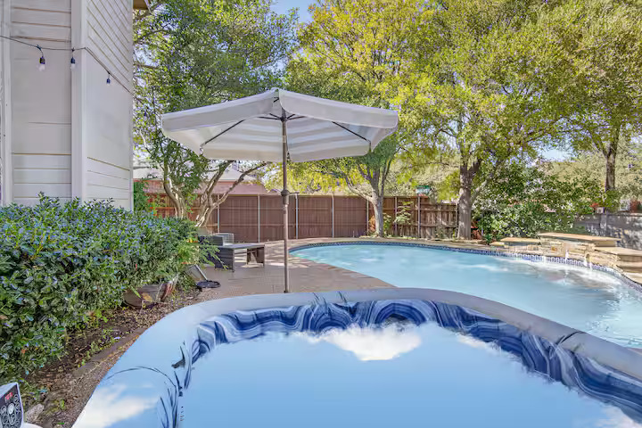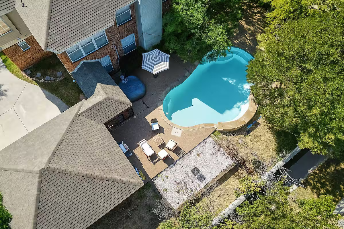 We have an incredible waterfall feature in our swimming pool, which is accessed from the rear door. Little ones shouldn’t be able to open the gate because we have fenced off the tiny patio. Unwind in the backyard with loved ones while enjoying the sound of the waterfall and grill. A family of squirrels provides some fun and creates a genuinely natural sense, while the enormous oak trees only serve to enhance the atmosphere.